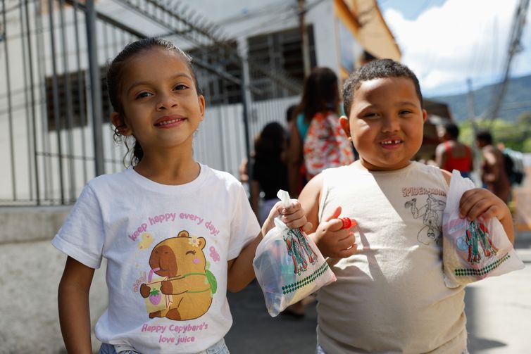 Rio de Janeiro/RJ - Um carro estaciona e buzina. Logo dezenas de crianças correm em direção a ele, disputando a entrega de saquinhos de doces.